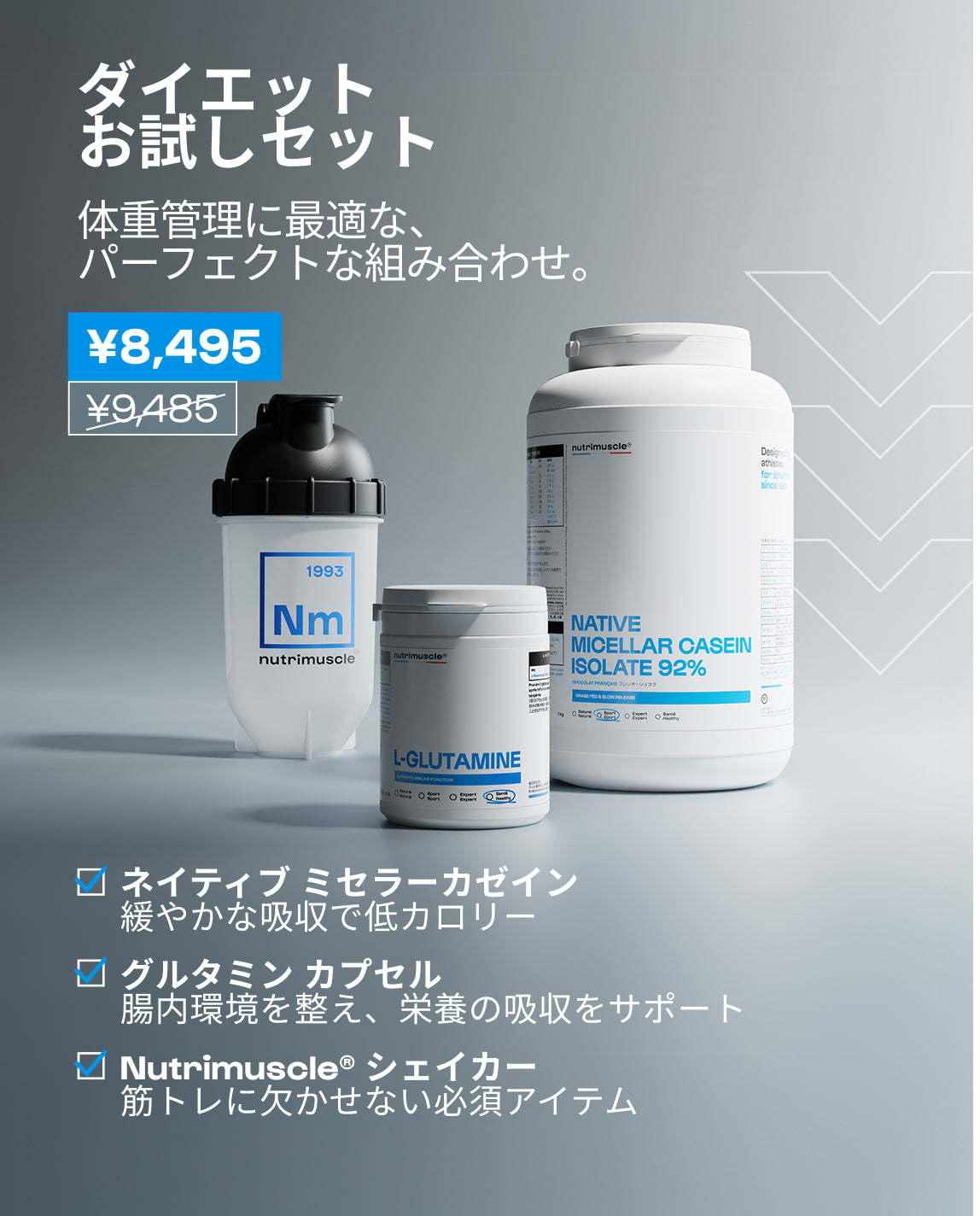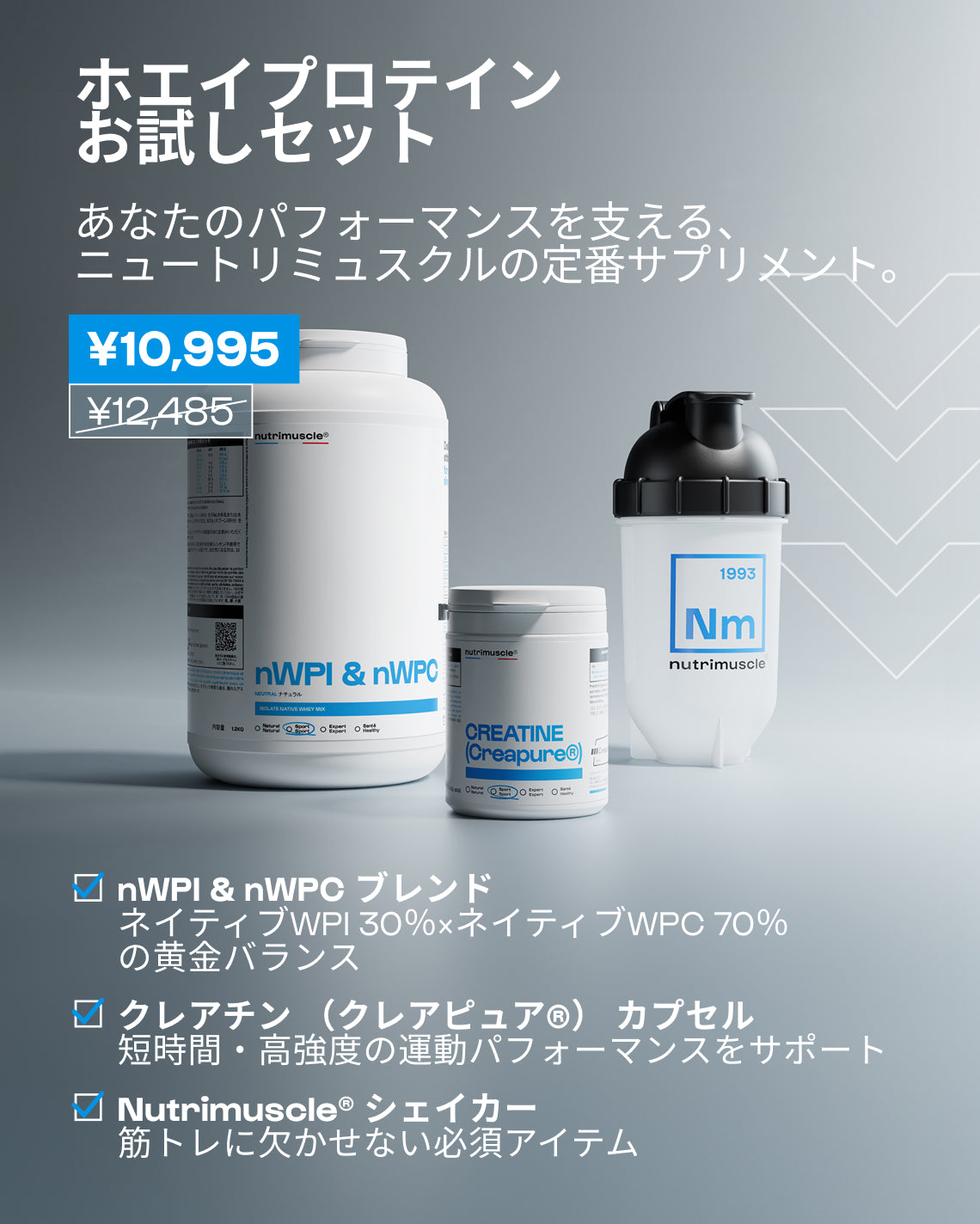 ニュートリミュスクルのお試しセットは、プロテイン・クレアチン・コラーゲンという筋肉づくりの3本柱を、最適なバランスで組み合わせています。